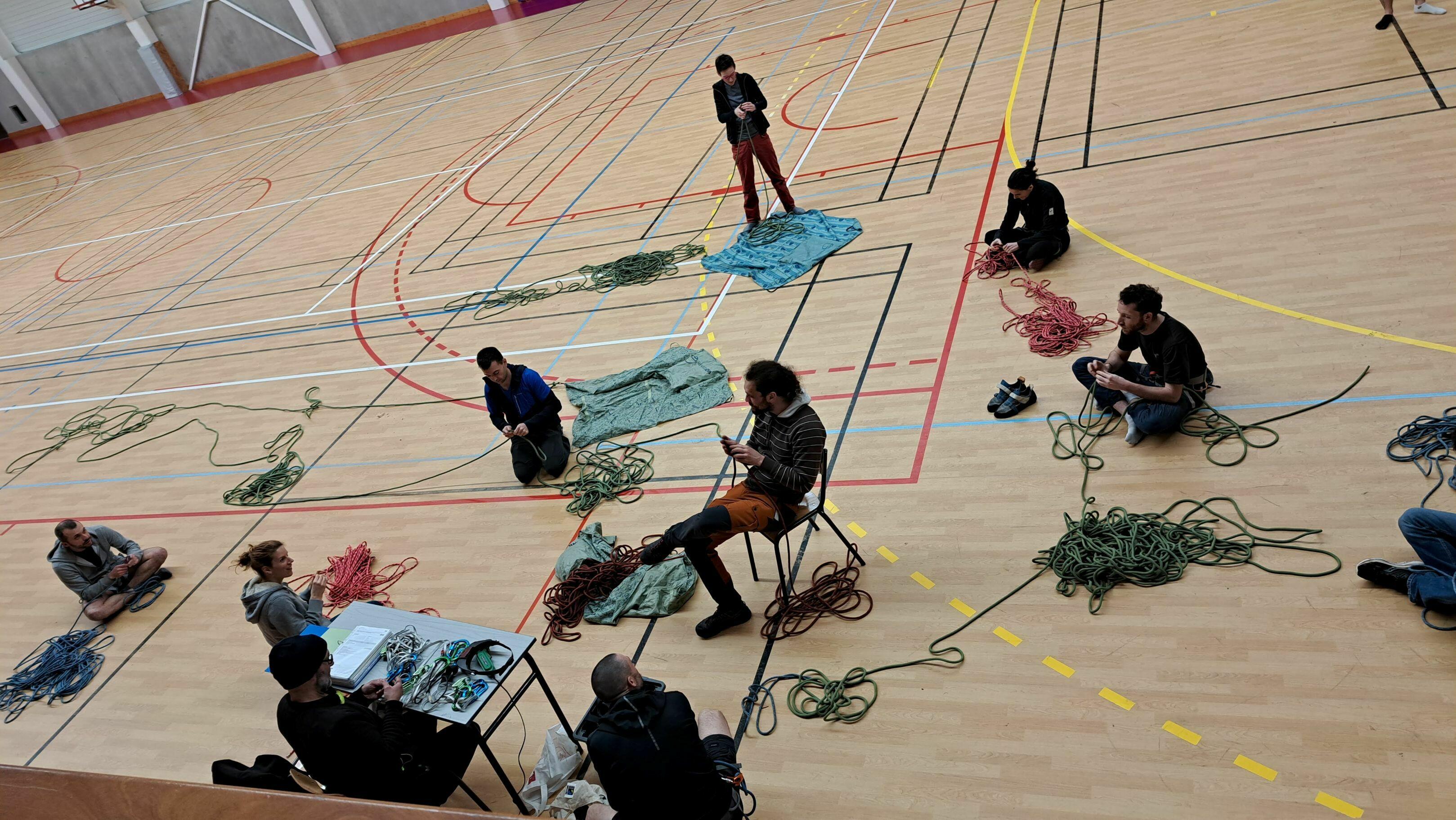 La séance a donc démarré par une vérification minutieuse de tout le matériel du club : cordes, dégaines, mousquetons, sangles, casques, etc.