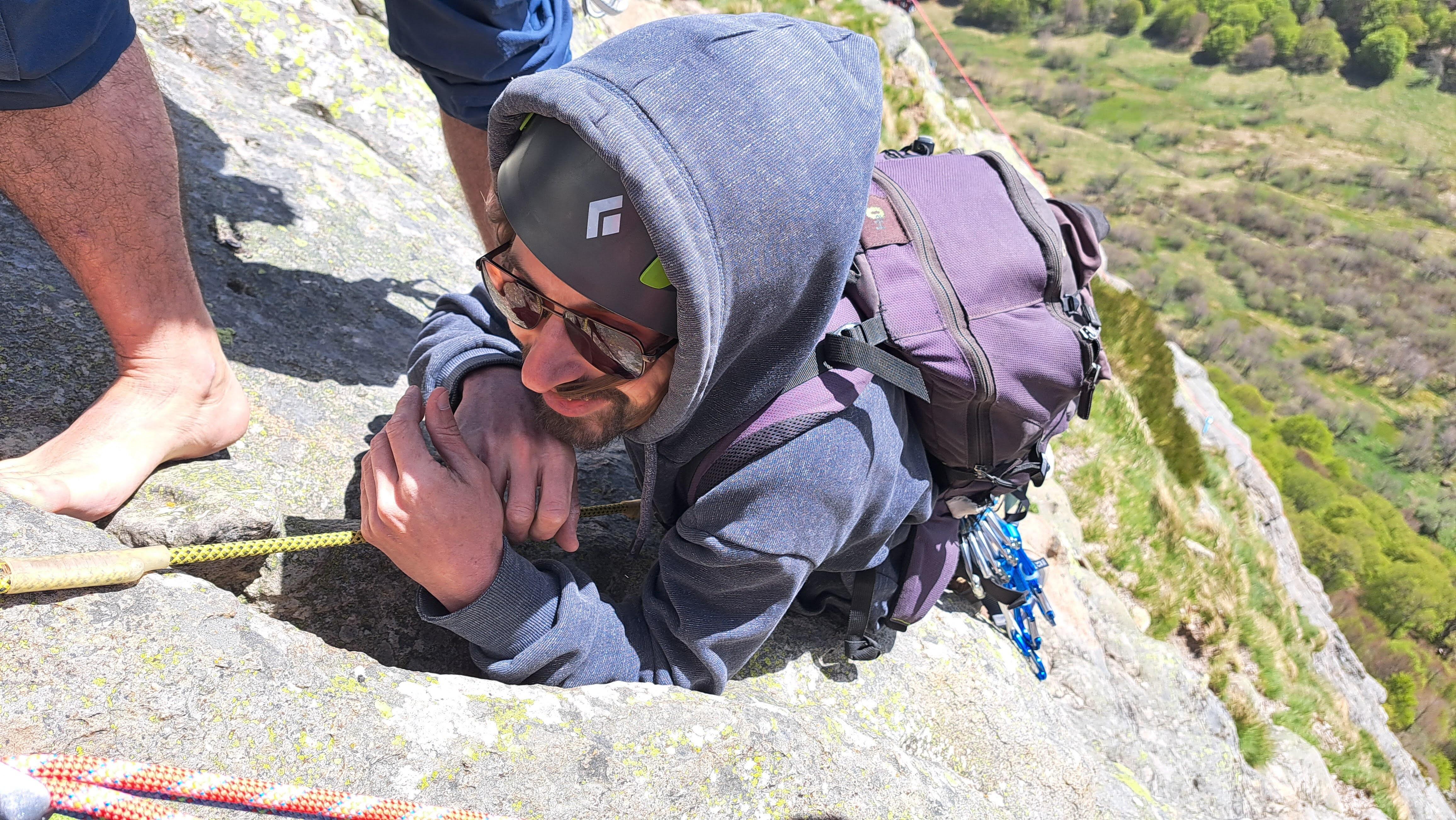 On arrive enfin en bas de la voie, tous un peu morts de faim… On s’installe, il n’y a pas beaucoup de place, mais il fait meilleur que tout là-haut. On sort les pique-niques, en attendant l’autre cordée.